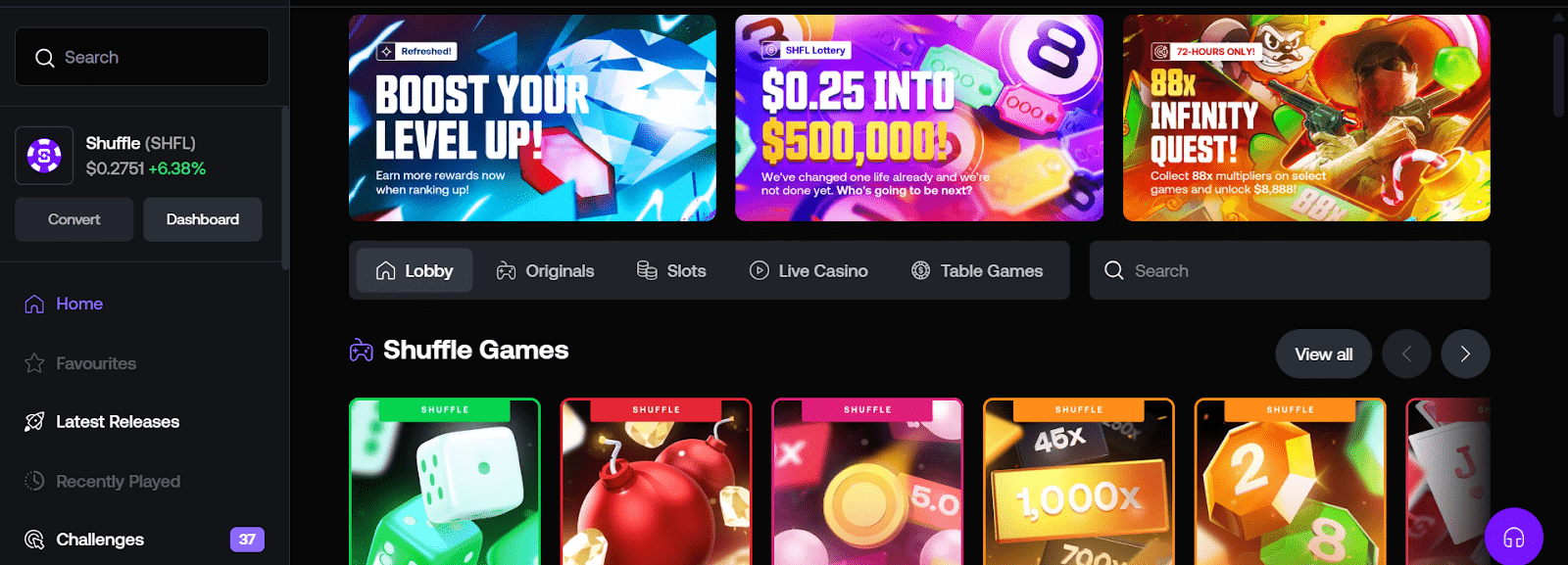 Shuffle’s rewards system is pretty decent, too. There’s no Welcome Bonus as such, but you can earn up to 15% cashback every week, with no betting limits, and join daily and monthly challenges for free spins, reload bonuses, and loot box giveaways. If you join the VIP program, the rewards get even better — think personalized rakeback, milestone bonuses, and access to high-stakes tournaments. There’s also a $10,000 Weekly Race, where you compete on the leaderboard for even bigger prizes. And if you’re feeling generous, you can share your winnings by dropping a fellow player a tip in chat.