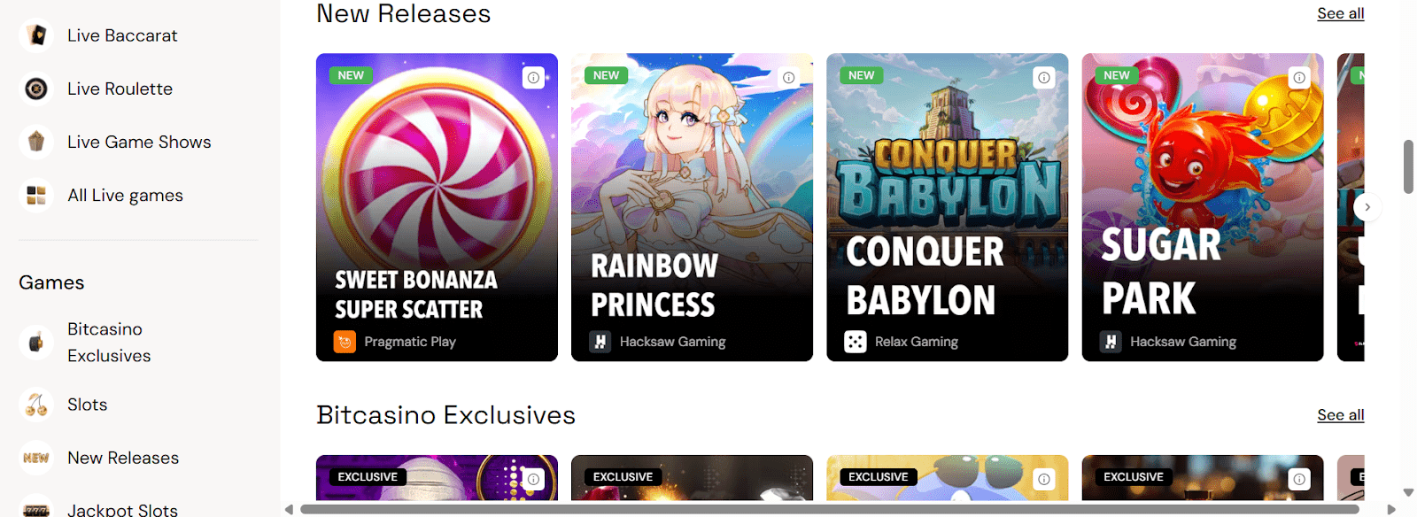 BitCasino.io, born into the crypto universe way back in 2014, is one of the “OGs” in the crypto casino world, one of the first and most established platforms out there: trusted, well-known, and still going strong. From the moment you land on the site, the fun begins, with 3,000+ easy-to-navigate games. There’s a ton to explore here, from slots, provably fair games, and live dealer tables to exclusive releases from providers like Evolution Gaming and Pragmatic Play.