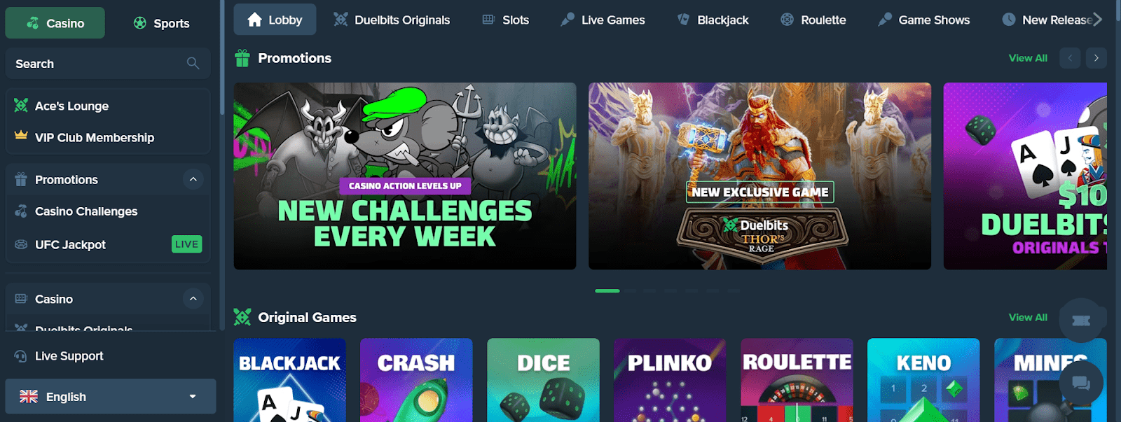 I’ve spent some time playing on Duelbits, and if you’re into crypto gambling with a good mix of casino and esports, it’s definitely one to check out. It launched in 2020 and delivers about 4,000 games from over 60 top providers. You’ll find everything there to inspire, from slots, table games, and live dealers to provably fair originals like Dice Duels and Minesweeper.