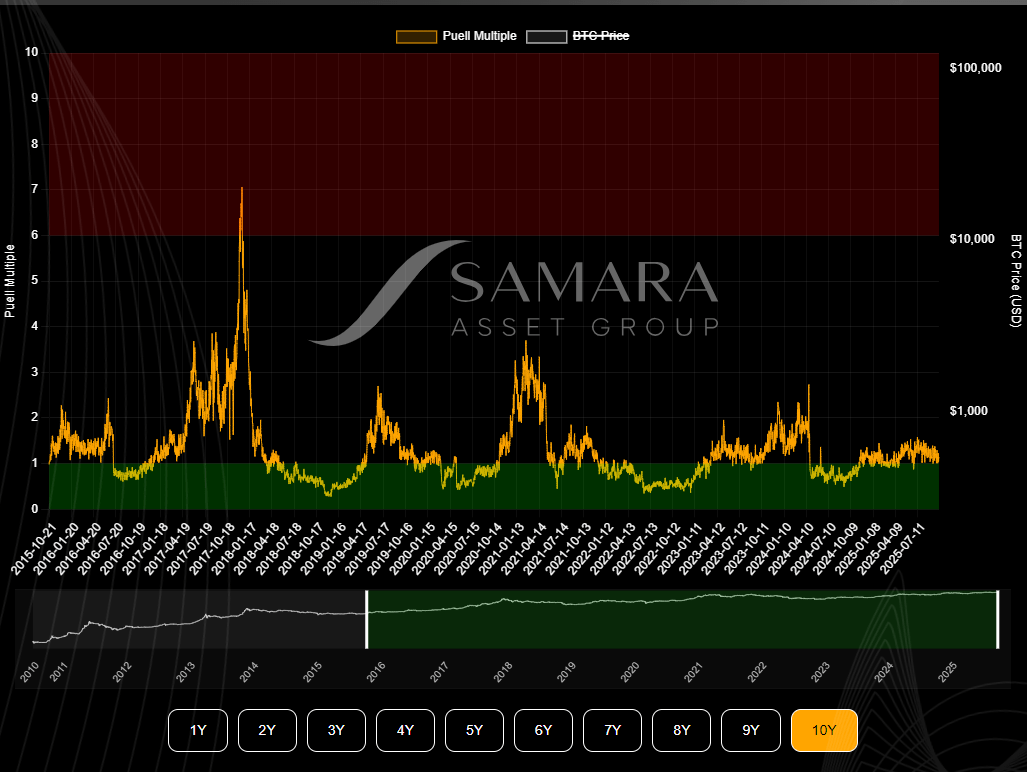 The Puell Multiple, created by analyst David Puell, measures miners’ daily revenue against its historical average. It’s one of the most established on-chain tools for understanding Bitcoin’s market cycles based on the profits miners make.