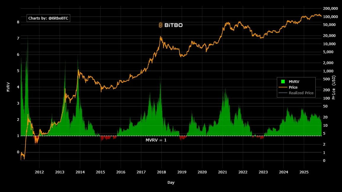 An MVRV ratio above 3.5 has often marked cycle tops, while readings below 1.0 indicate that most investors are underwater, which are conditions often associated with accumulation phases.