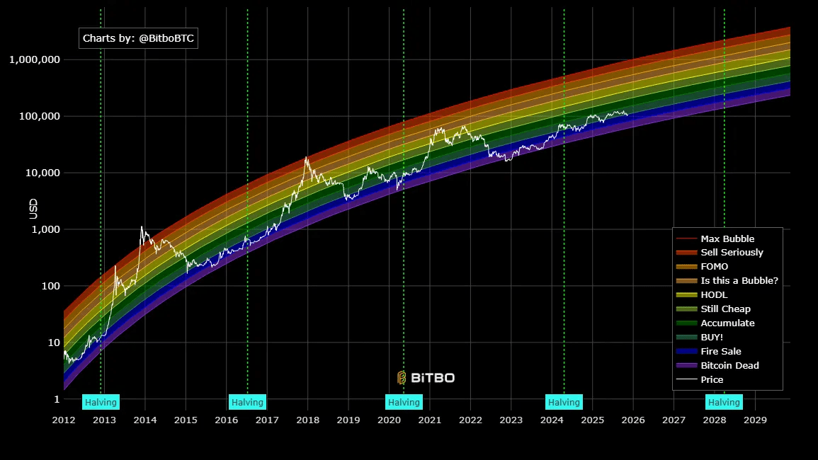 The chart is built on a log-scale regression line of bitcoin’s historical price, with additional colored bands added above and below the trend line. Each color corresponds to a sentiment level. Blue means undervalued, yellow means fairly priced, and red indicates bubble territory. There’s no industry standard formula behind the bands. The chart is a heuristic visualization of historical valuation zones rather than a precise analytical model.
