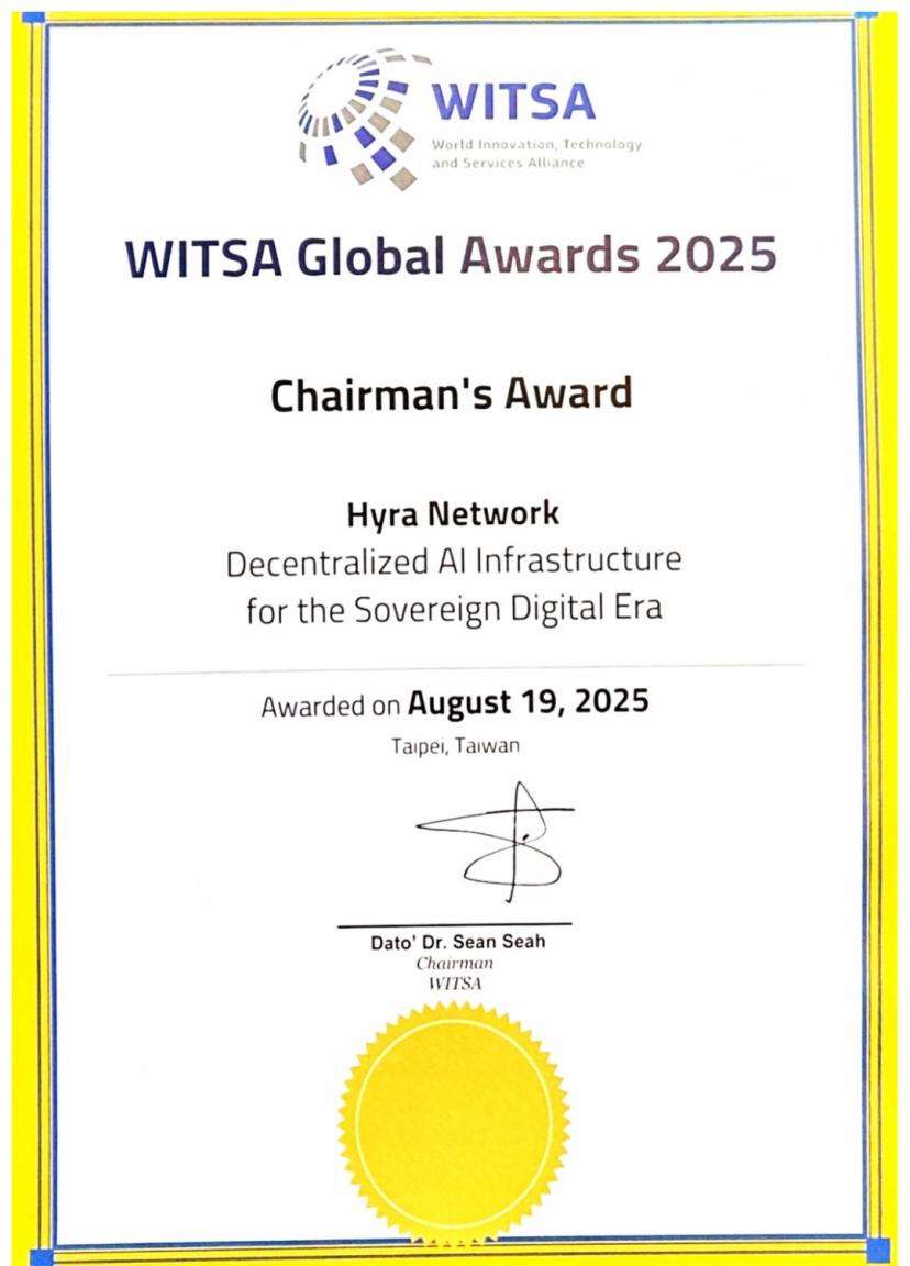 “The Chairman’s Award is reserved for truly outstanding initiatives that demonstrate exceptional innovation and global impact,” said Dato’ Dr. Sean Seah Kok Wah, Chairman of WITSA. “Hyra Network’s vision for decentralized, sovereign AI sets a new benchmark and is helping shape the future of the AI industry.”