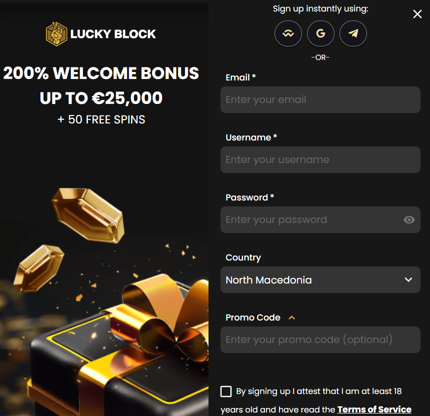 Claiming your bonus is simple. But you could lose out on extra cash if you do it wrong. To start, sign up on the Lucky Block website. Make sure you enter a Lucky Block casino bonus promo code at the bottom of the signup form if you have one. When you are done registering, make your first deposit. It must be at least €20.