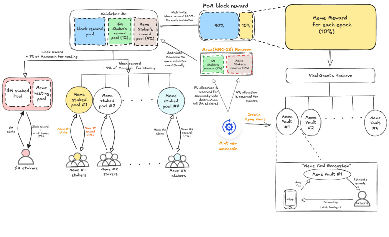The PoM consensus mechanism combines elements of Proof-of-Authority and delegated Proof-of-Stake, with validator roles rotated every 10 blocks. Validators are required to self-stake 7 million $M tokens, while delegators may stake either $M or whitelisted meme coins. Rewards are distributed across $M stakers (75%), meme token delegators (24%), and block proposers (1%).