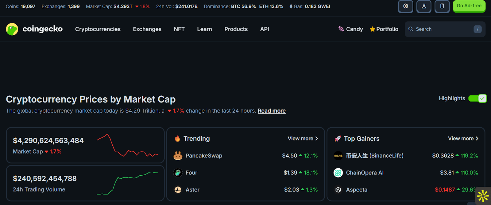 - Cryptocurrency market data: Tracks the price, market capitalization, trading volumes, and historical data for thousands of cryptocurrencies, offering real-time updates.
