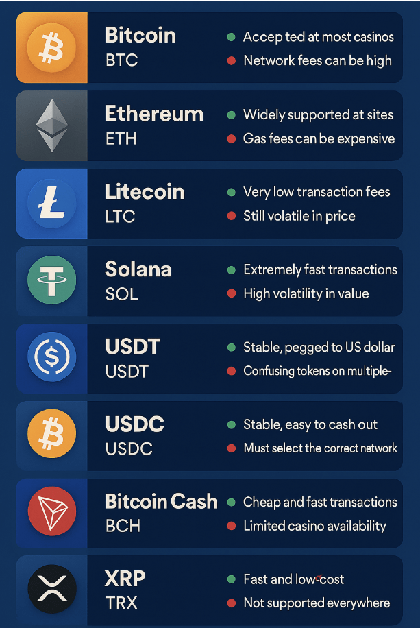 - Not supported by all casinos—support is more patchy than BTC/LTC/USDT.