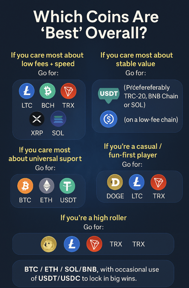 If your goal is purely to play roulette and withdraw cleanly, USDT (on TRON or another low-fee chain) is one of the best choices.