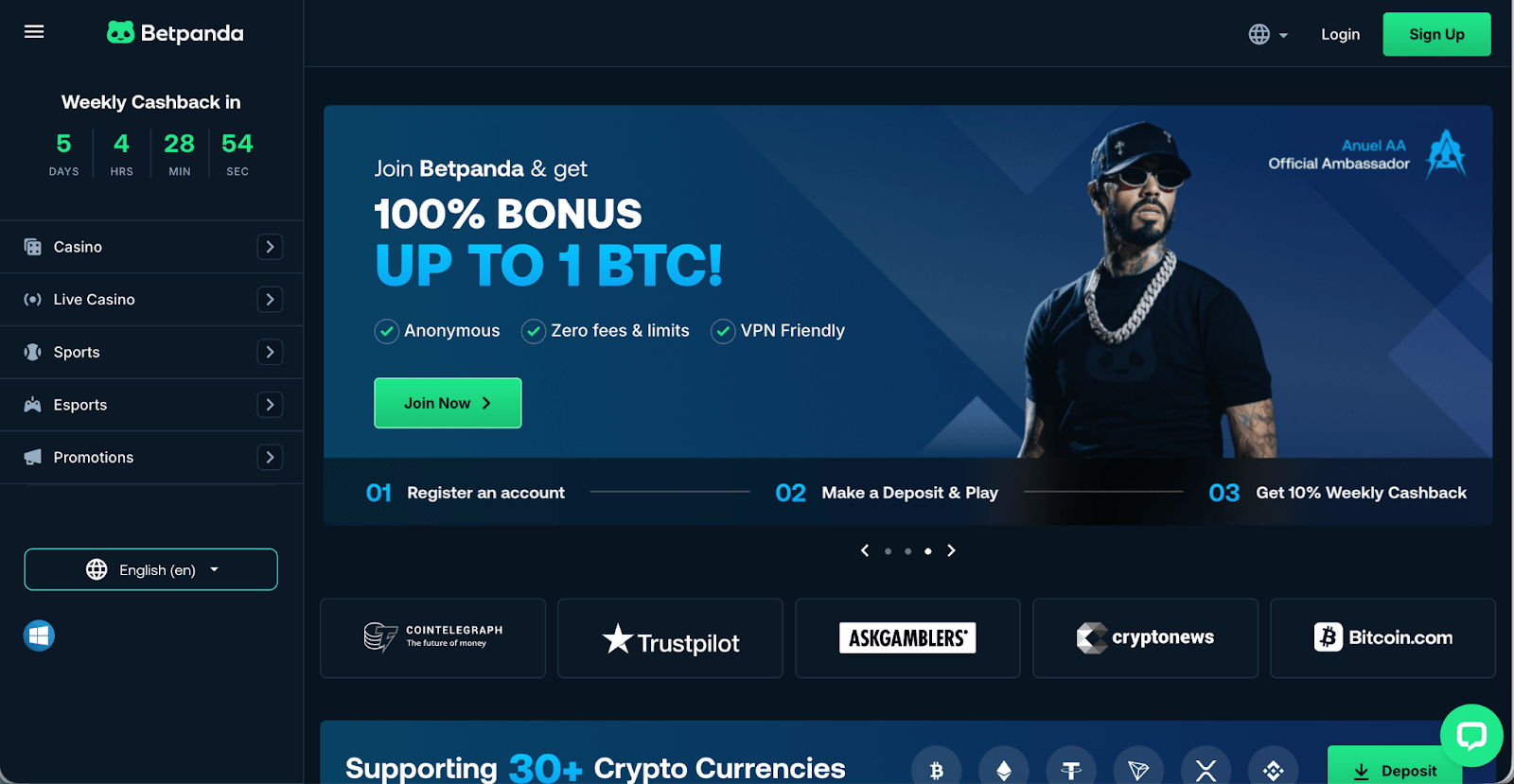 | betpanda | 100% up to 1 BTC / 10% weekly cashback | Over 5,000 gamesNo KYC (Know Your Customer ID verification)Lightning withdrawals SportsbookVIP rewards | BTC, ETH, USDT, LTC, XRP, DOGE, TRX, BNB, SOL, TON |