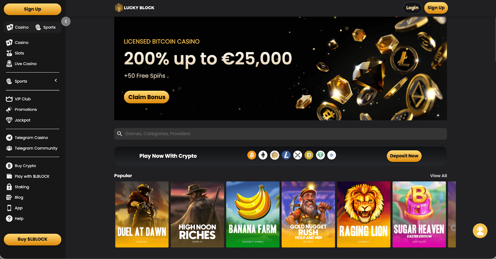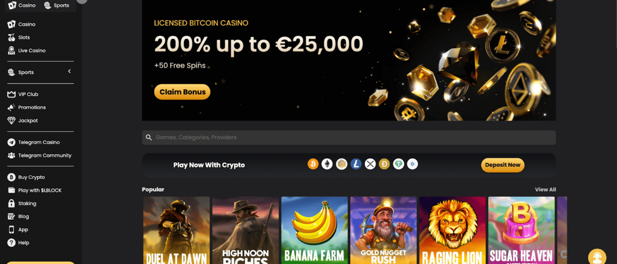 | lucky-block | New player 200% match, up to €25,000 + free spins | Over 4,000 gamesAn impressive sportsbookVIP programInstant withdrawals | Over 20 cryptocurrencies, including BTC, ETH, USDT, LTC, DOGE |
