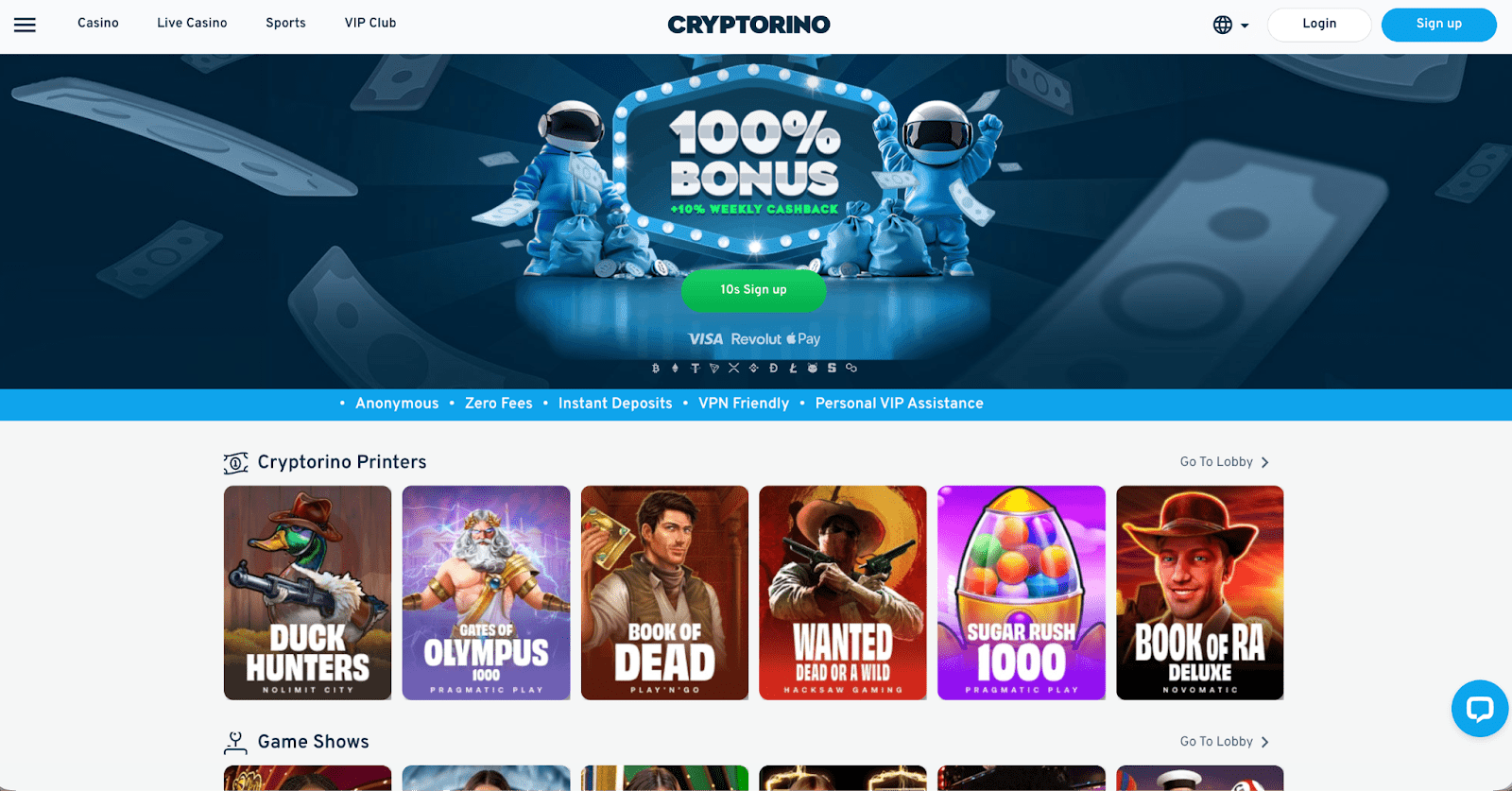 | cryptorino | 100% bonus and 10% weekly cashback | Wide range of gamesNo KYCProvably fair gamesSportsbookVIP clubInstant crypto payoutsGood reviews on customer service | BTC, BNB, DOGE, ETH and others |